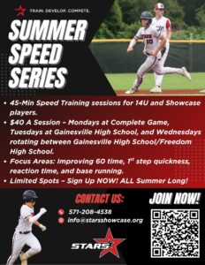 STARS Speed Series - 14U and Showcase OUTSIDE at Gainesville Turf 8:00 pm – 8:45 pmJune 18, 2025 Gainesville High School13150 University BlvdGainesville, Virginia 20155View LocationMap Gainesville High School Buy Tickets iCal Google Calendar View full calendar